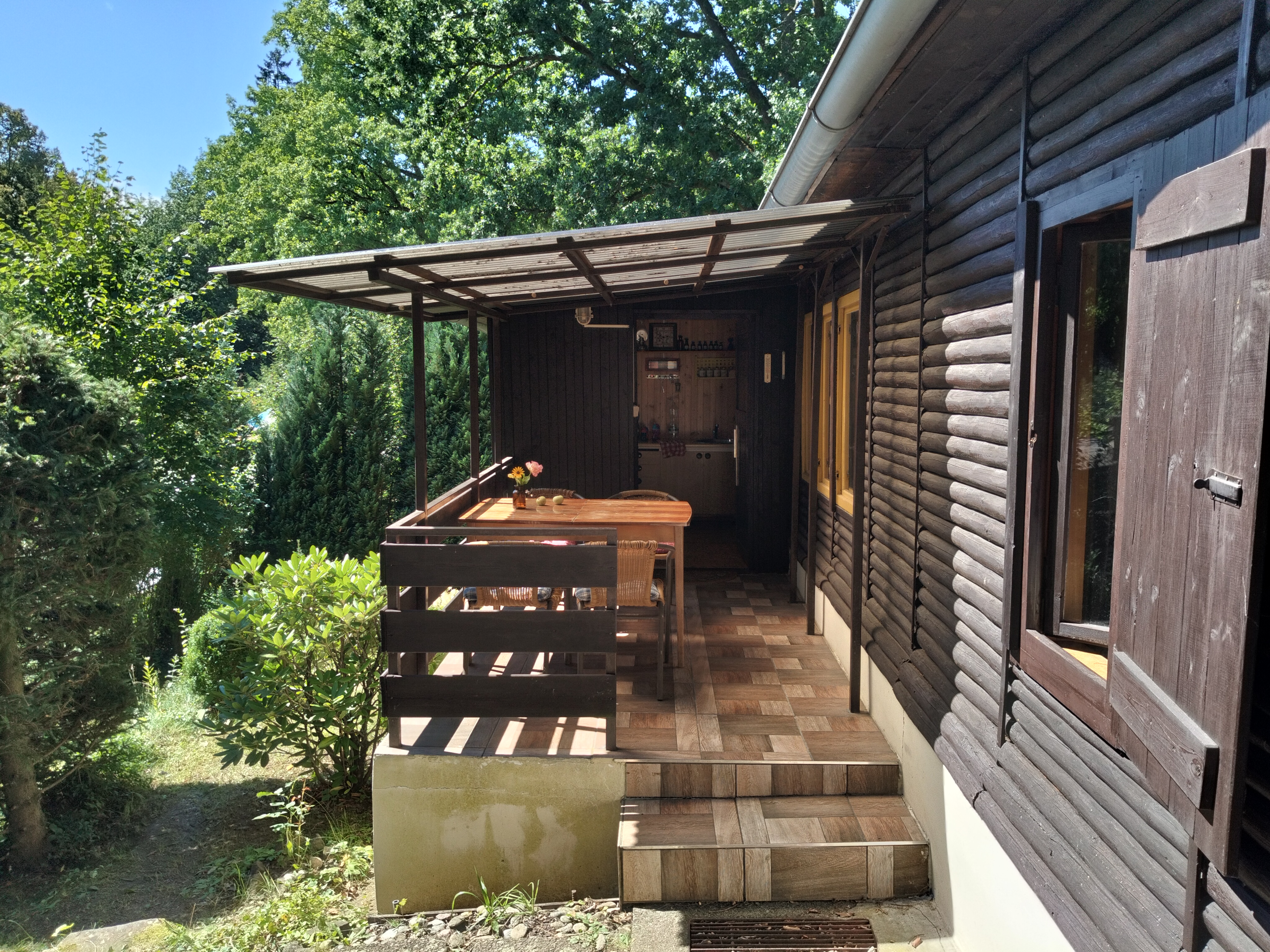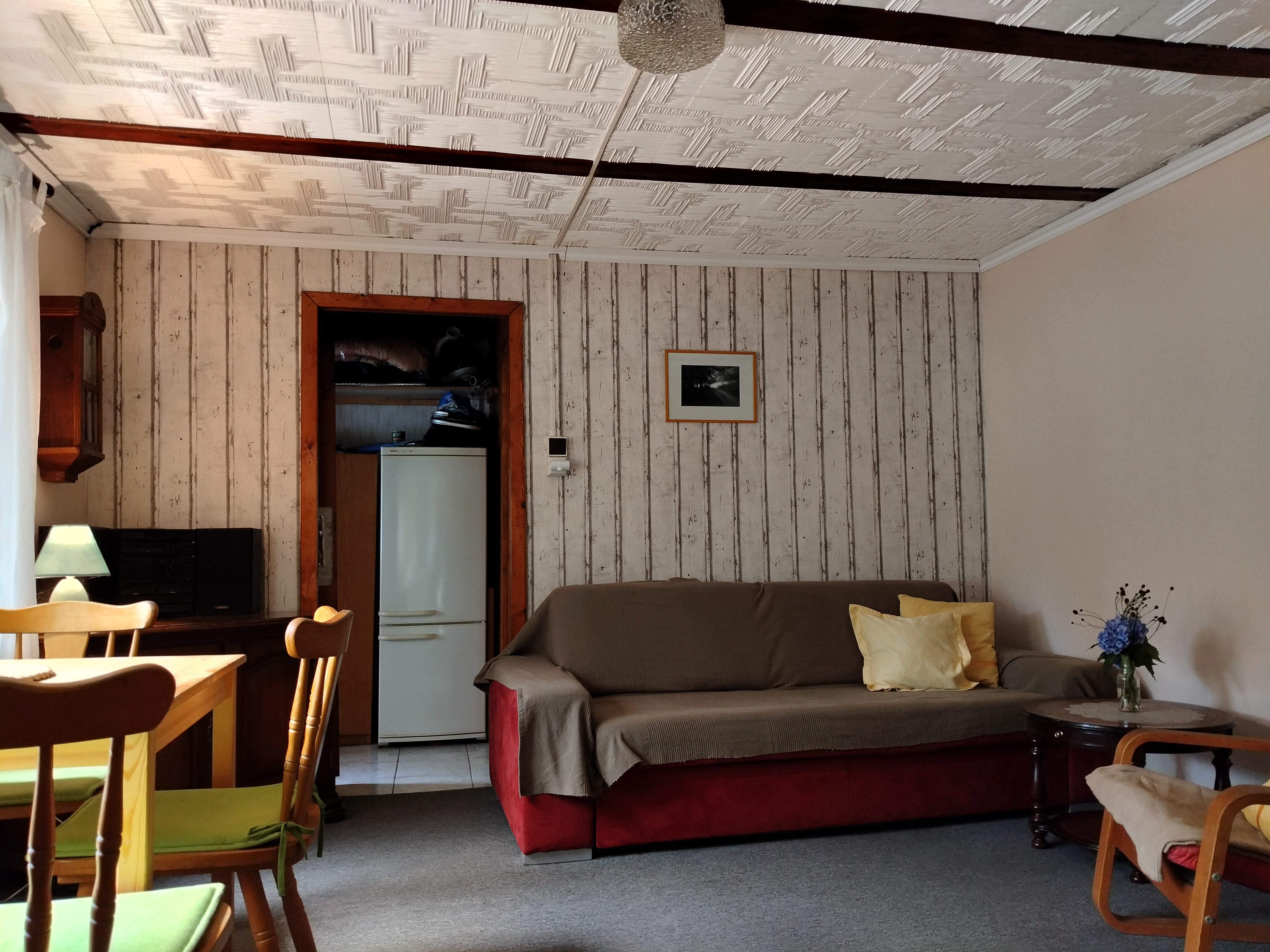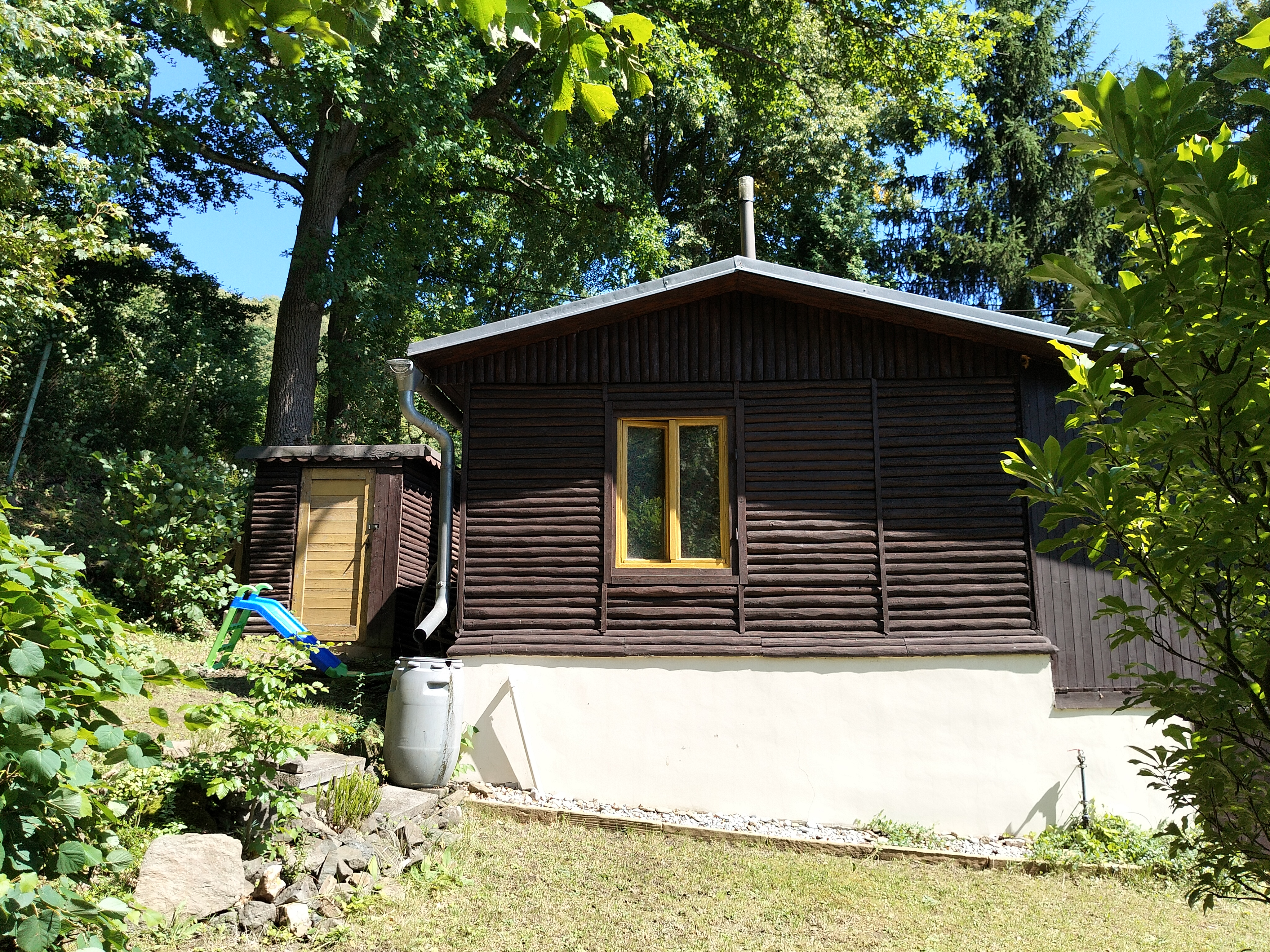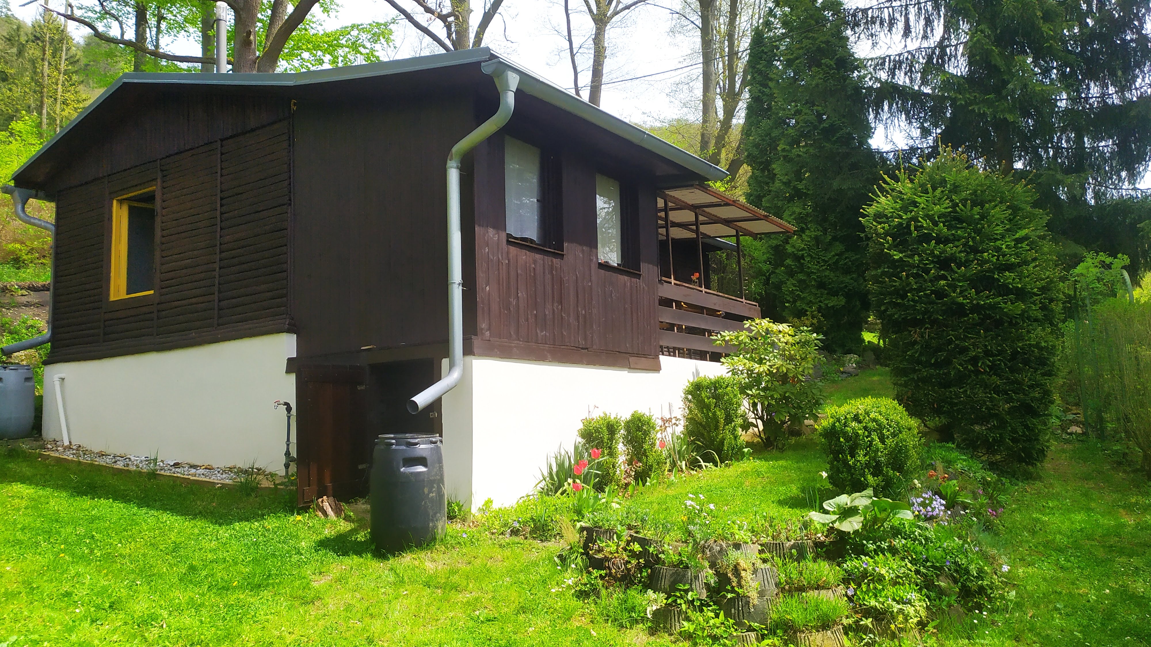 Dispozice: krytá terasa s posezením, kuchyňka, koupelna s vanou a kompostovací toaletou, obývací pokoj, dvě menší ložnice, sklípek s technickým zázemím, kůlna