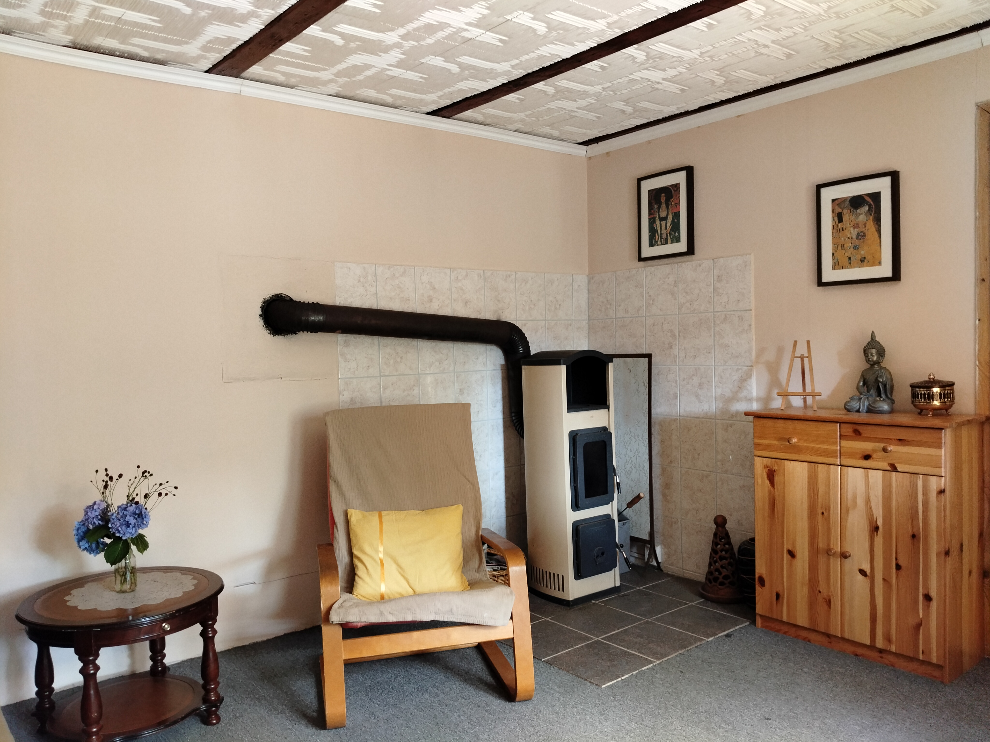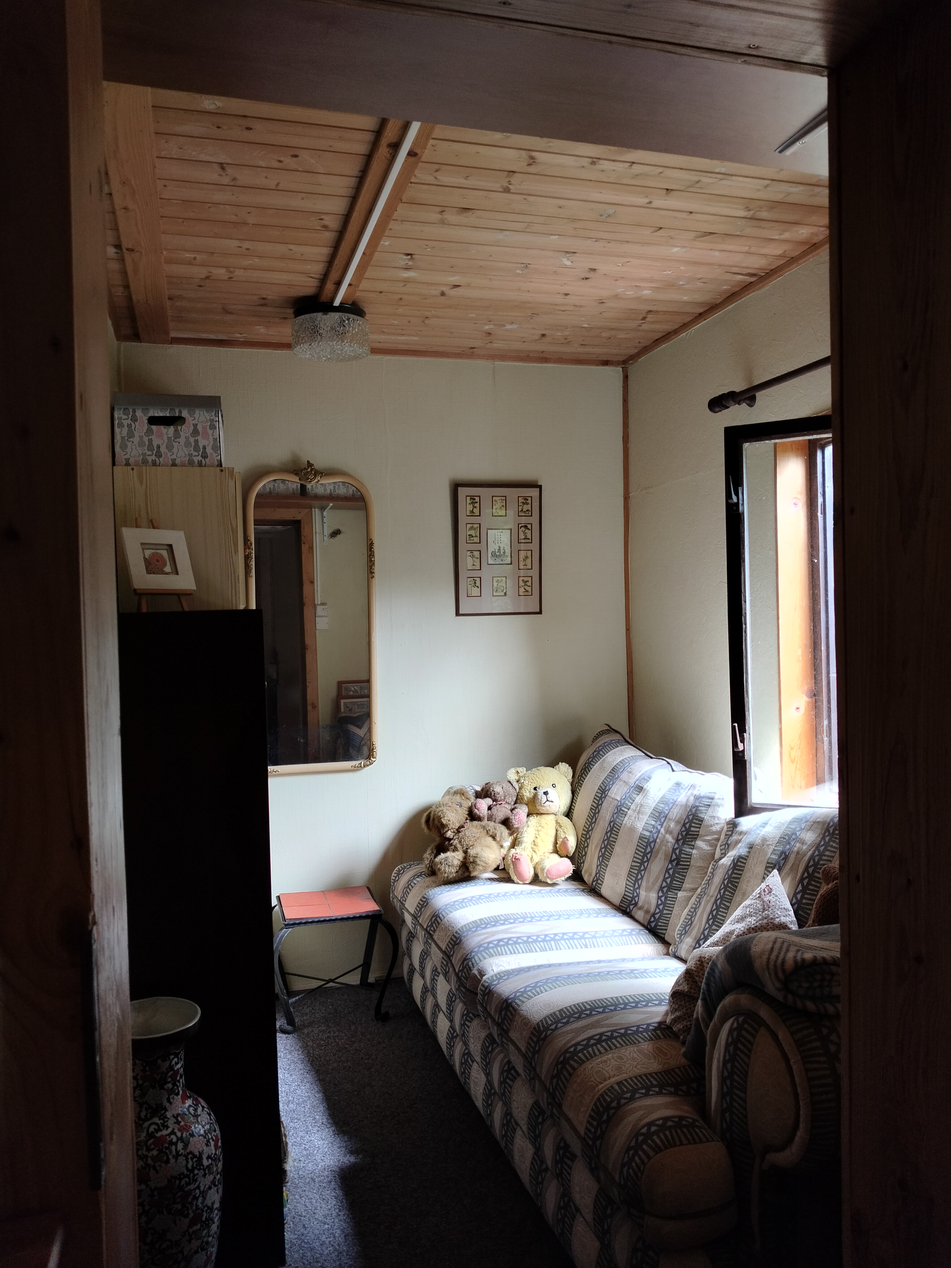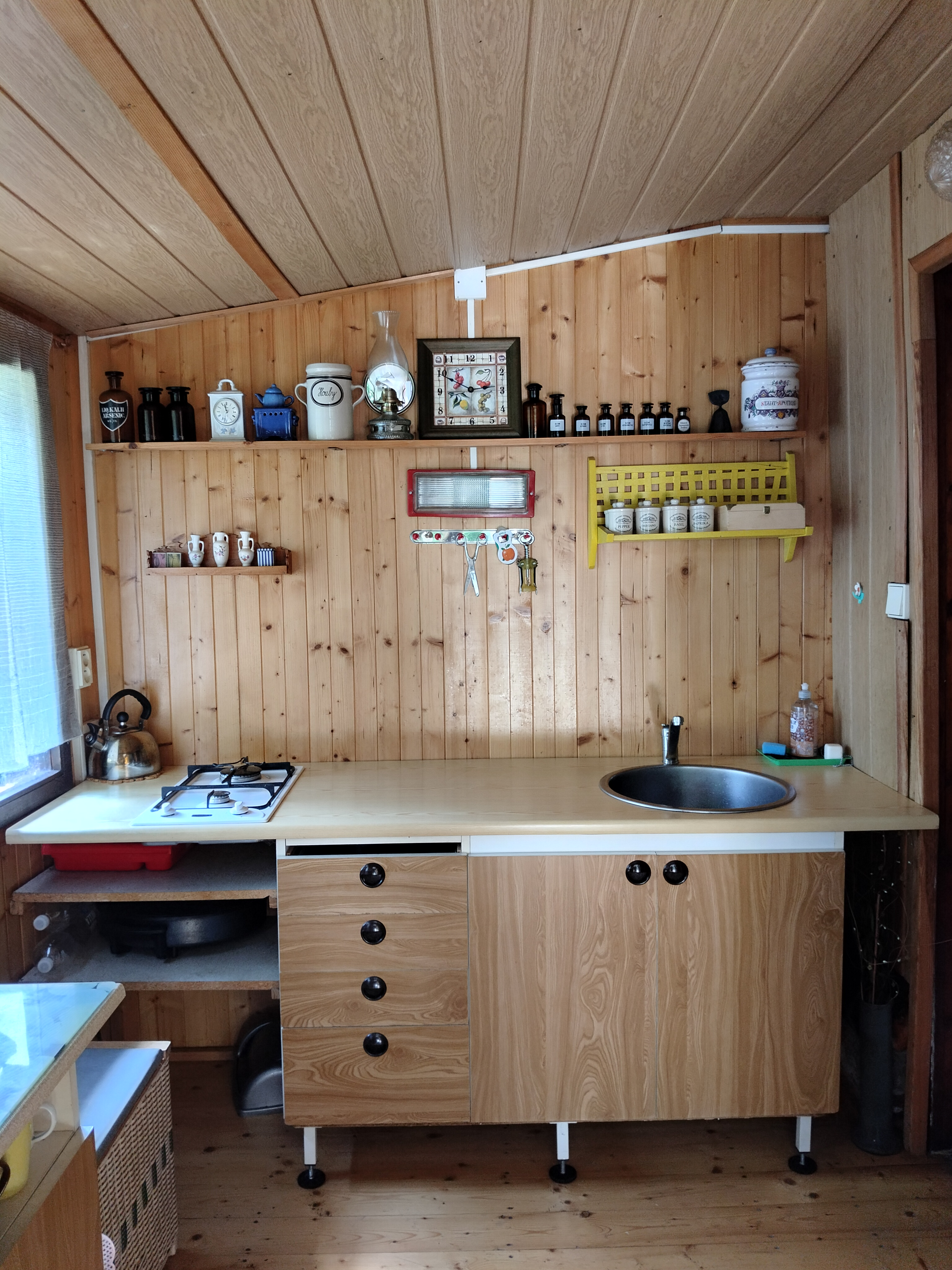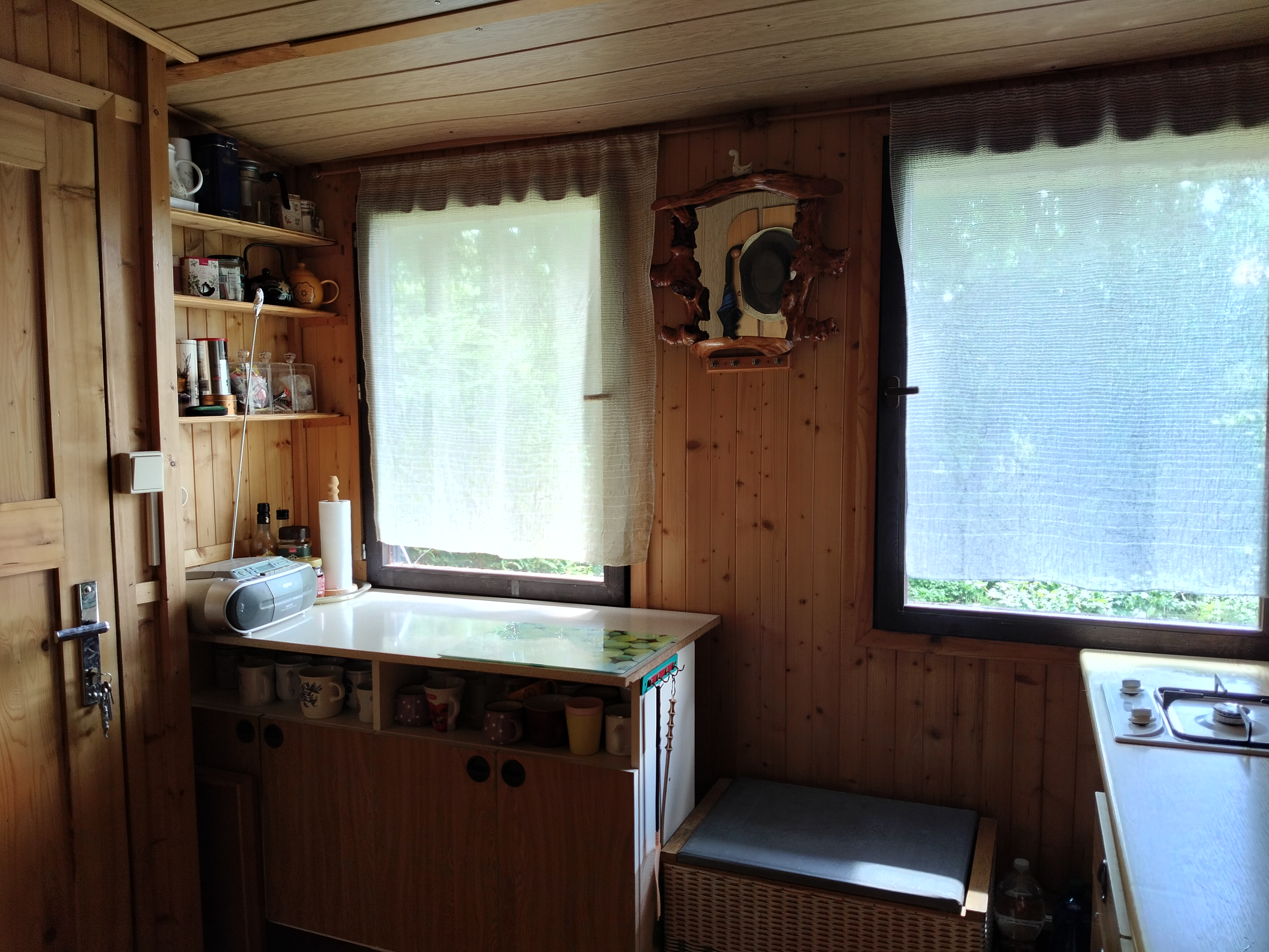 Dispozice: krytá terasa s posezením, kuchyňka, koupelna s vanou a kompostovací toaletou, obývací pokoj, dvě menší ložnice, sklípek s technickým zázemím, kůlna